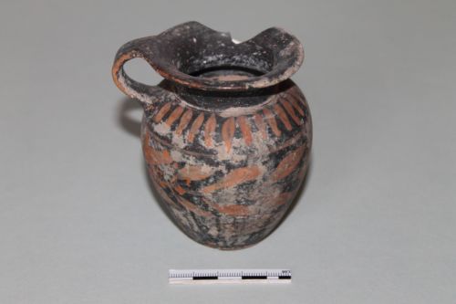 Piccola oinochoe con basso piede a disco sagomato, corpo a profilo ovoidale, breve collo cilindrico che si allarga con un orlo estroflesso e labbro arrotondato. L'ansa a nastro si imposta sulla spalla e termina direttamente sul labbro. Il decoro dipinto, che interessa tutto il corpo, è costituito da una sequenza di fogle lanceolate a rappresentare una corona d'alloro, delimitata superiormente da una fascia campita da una sequenza di larghi segmenti verticali.