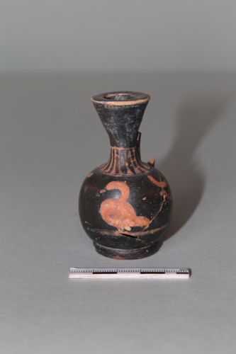 Lekythos aryballica con corpo a profilo globulare schiacciato, piede distinto a profilo troncoconico, breve collo cilindrico separato dal bocchello campanulato da una leggera risega; l'ansa frammentaria a bastoncello si imposta dalla spalla all'attacco dell'orlo. Il decoro dipinto presenta un volatile, forse un cigno, volto a sinistra con alla sua destra un racemo vegetale stilizzato. Alla base del collo è presente una sequenza di brevi tratti verticali.