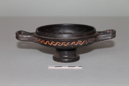 Lekanis con corpo a profilo emisferico schiacciato e alto piede distinto: L'orlo verticale è caratterizzato da un labbro verticale leggermente arretrato per l'alloggiamento del coperchio; le anse orizzontali contrapposte presentano una sezione a nastro e risultano leggermente oblique. Il decoro, dipinto nella sezione verticale del corpo sopra la spalla, presenta una sequenza di brevi tratti a "S" coricata, che riproducono un motivo "a onde" molto stilizzato.