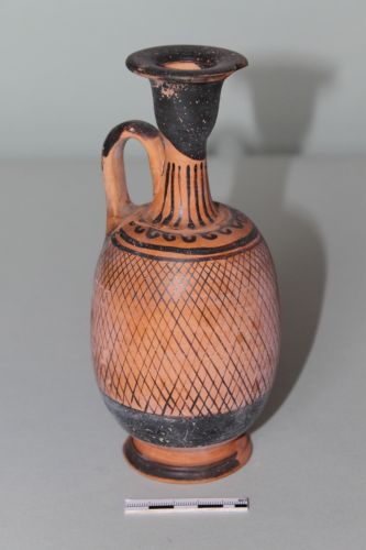 Lekythos con corpo a profilo ovoidale allungato, piede distinto a profilo troncoconico con raccordo cilindrico, breve spalla e collo cilindrico leggermente svasato alla base, separato dal bocchello campanulato da una leggera risega; l'ansa a bastoncello si imposta dalla spalla alla base dell'orlo. Il decoro dipinto è presenta un fitto reticolo che interessa tutto il corpo mentre nella parte inferiore del collo è dipinta una sequenza di bastoncelli verticali terminanti inferiormente a un uncino.