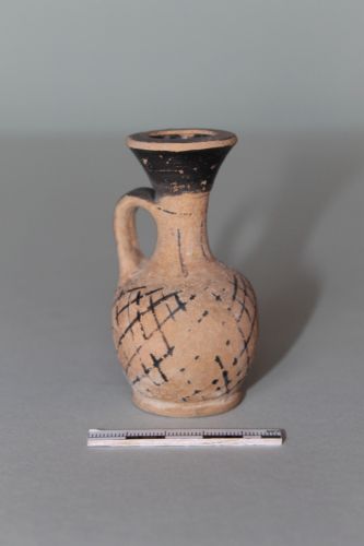 Lekythos aryballica con corpo a profilo ovoidale schiacciato, basso piede distinto a profilo troncoconico, breve collo cilindrico separato dal bocchello campanulato da una leggera risega; l'ansa a bastoncello si imposta dalla spalla all'attacco dell'orlo. Il decoro dipinto presenta un reticolo che interessa tutto il corpo mentre una sequenza di linee verticali decora la parte inferiore del collo.