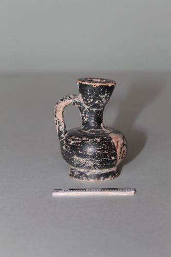 Lekythos aryballica con corpo a profilo globulare schiacciato,piede distinto a profilo troncoconico, breve collo cilindrico separato dal bocchello campanulato da una leggera risega; l'ansa a bastoncello si imposta dalla spalla all'attacco dell'orlo. Il decoro dipinto è presenta un profilo femminile racchiuso entro palmette.