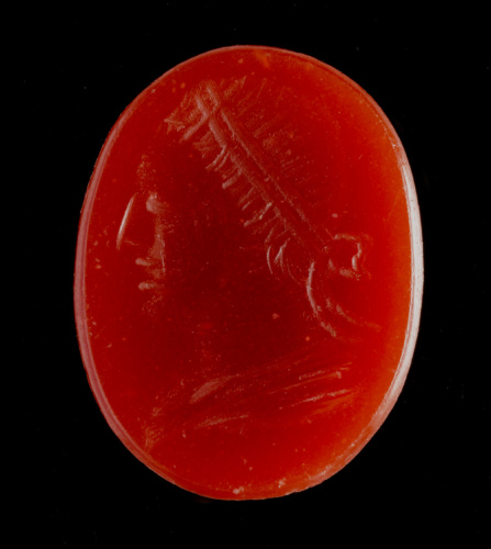 Pasta vitrea rossa di forma ovale piana/piana con raffigurazione di testa maschile di profilo a sinistra, con nastro annodato sulla nuca, i cui capi scendono lungo il collo. La rappresentazione dei capelli, a striature parallele, evoca una corona radiata. La raffigurazione comprende il collo e l'attacco del busto, ove si nota un accenno di panneggio. La resa del profilo (fronte spiovente, naso aquilino) è assai stilizzata, come si nota dalla raffigurazione della bocca, ottenuta grazie a due brevi tratti paralleli.