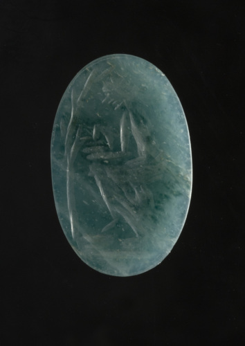 Diaspro verde di forma ovale allungata piana/piana con incisa una figura femminile, con le gambe avvolte in un mantello, seduta di profilo verso sinistra; probabilmente regge in mano un oggetto non identificabile; di fronte, sul lato sinistro della pietra, un albero ricurvo; breve linea del suolo. Lo stile dell'intaglio, incoerente e sommario, è caratterizzato da solchi giustapposti e potrebbe essere attribuito a quella che H. Guiraud 1988, pp. 54-56, definisce courant incohérent, collocata cronologicamente nel II-III secolo d.C.