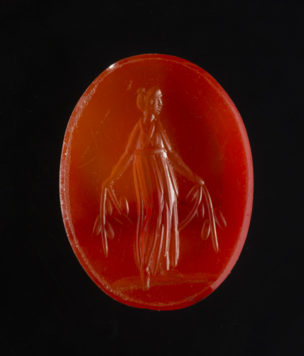 Corniola rossa di forma ovale piana/piana, su cui è incisa con intaglio profondo una figura femminile stante, di trequarti, con la testa rivolta a destra e i capelli raccolti. Indossa una lunga veste (altocinta, incrociata sul petto, che lascia le braccia nude); con entrambe le mani regge una ghirlanda molto stilizzata, che passa dietro la schiena. Linea del suolo, breve e spessa, oltre la quale sporge uno dei piedi. La figura risulta molto allungata e con la testa piccola; la gamba destra flessa è ben delineata sotto le pieghe della veste.