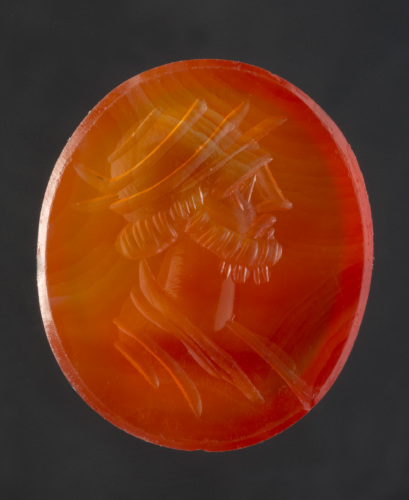 Corniola di forma ovale piana/piana con incisa una testa maschile barbata di profilo a destra. La raffigurazione comprende parte del busto, panneggiato con scollo a punta. Da notare il tipo particolare di copricapo a solcature concentriche, con due elementi davanti e due dietro. Il profilo è caratterizzato dal naso diritto e l'occhio grande. I capelli che fuoriescono dal copricapo sono resi a fitti e brevi tratti paralleli; caratteristica la raffigurazione della barba con doppia fila di ciocche.