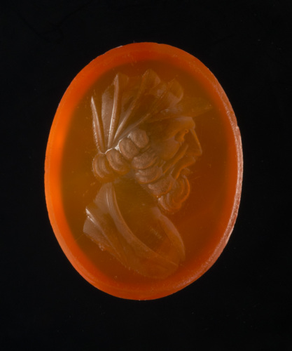 Corniola di forma ovale piana/piana con inciso busto di guerriero. La testa maschile barbata con elmo è di profilo a destra; la raffigurazione comprende parte del busto con l'attacco del panneggio (o forse della corazza). Da notare l'elmo, con visiera, caratterizzato da quattro elementi rilevati. I capelli, che fuoriescono dall'elmo intorno alla nuca, e la barba sono resi a grosse ciocche.