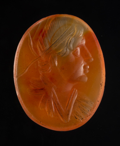 Corniola arancione di forma ovale piana/piana con incisa una testa maschile di profilo a destra, con tenia annodata sulla nuca (da notare i capi del nastro, raffigurati in maniera rigida, come se fossero agitati dal vento, uno rivolto verso l'alto, l'altro verso il basso). Il busto è raffigurato di prospetto fino all'attacco delle spalle, con veste (una serie di linee diagonali che si distribuiscono attorno allo scollo a punta). La capigliatura è rappresentata da una serie di linee sottili e parallele incise sulla calotta cranica, mentre sulla fronte, al di sotto del nastro, si dispone una serie di riccioli formati da brevi tratti curvi. Da notare infine le guance rigonfie e il mento rotondo (le labbra sono rappresentate da due brevi e grossi tratti paralleli); evidenziata la linea della mascella.