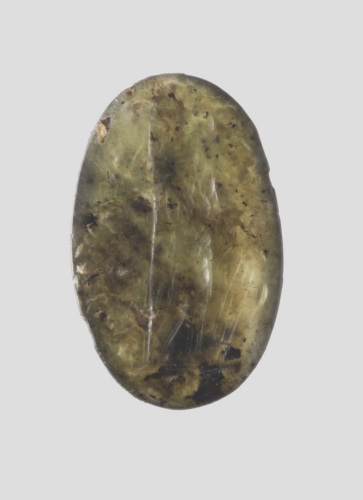 Prasio di forma ovale allungata piana con incisa una figura stante con testa a destra, su breve linea del suolo. L'intaglio non è chiaramente leggibile: probabilmente si tratta di un personaggio femminile, con una veste alle ginocchia, forse disposto di tre-quarti. Si distinguono due attributi: col braccio sinistro piegato regge un lungo bastone puntato al suolo, desinente con un elemento globulare (si possono forse individuare anche dei nastri svolazzanti proprio sotto il globo): potrebbe trattarsi di un tirso. Più difficile da identificare l'elemento posato al suolo e sostenuto dalla mano destra: sembra trattarsi di una fascina di legno (forma rettangolare allungata, formata da tre elementi sottili, con due tratti orizzontali, uno in basso e uno in alto). La gamba di sostegno è quella destra, mentre la sinistra risulta leggermente flessa.