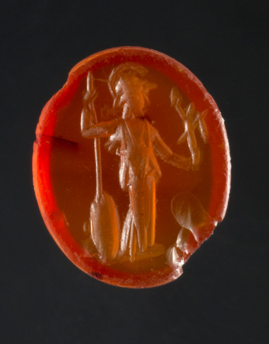 Corniola di forma ovale piana/piana su cui è incisa una raffigurazione di Atena Minerva. La dea stante, di prospetto, con la testa di profilo verso destra, indossa una lunga veste (peplo, mantello; forse le linee sul petto indicano l'egida), sotto le cui pieghe risalta la gamba destra lievemente flessa (il peso poggia sulla sinistra); si può forse indovinare nel panneggio sulle spalle un corto mantello; sulla testa, l'elmo (corinzio crestato?); col braccio destro piegato ad angolo retto si appoggia sulla lancia puntata al suolo (questo particolare suggerisce che l'immagine sia stata incisa per essere letta direttamente sulla pietra), davanti alla quale è raffigurato lo scudo posato a terra; nella mano sinistra tesa in avanti regge una statuina di Vittoria alata con lancia e corona tenuta sollevata, resa in modo schematico; breve linea del suolo. Si tratta di una variante assai diffusa del tipo della Parthenos.