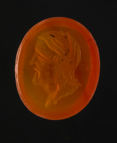 Corniola di forme ovale piana/piana su cui è incisa con intaglio abbastanza profondo una testa di vecchio (potrebbe anche essere una vecchia) di profilo a sinistra, con capelli lunghi (rappresentati da linee ondulate) sul collo, che scendono fin oltre l'accenno del busto. Ben marcata l'arcata sopraccigliare e la linea della mascella. Linee intorno alla bocca a rappresentare le rughe.