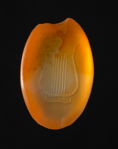 Corniola arancione ovale piana/fortemente convessa (forma 7); incisione