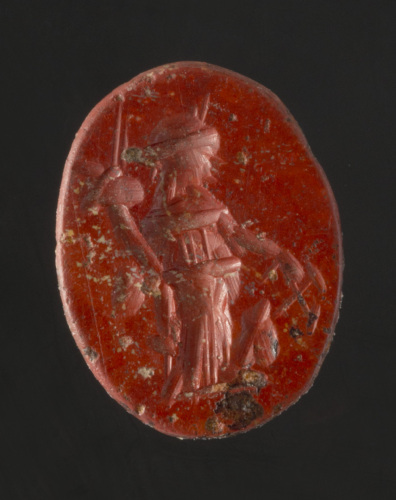 Diaspro rosso di forma ovale piana/piana con incisa l'immagine di Fortuna. La dea, in lunga veste, stante di prospetto su una breve linea del suolo, con testa rivolta a destra, regge la cornucopia col braccio destro e il timone nella sinistra rivolta verso il basso (forse di tipo C).