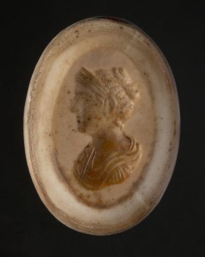 Agata di forma ovale piana/piana (forma 9c o 9?)con inciso un ritratto di dama di età traianea. Il busto femminile di profilo a sinistra è caratterizzato da un'elaborata acconciatura a crocchia e diadema sulla fronte; sul busto, tagliato sotto la spalla, il panneggio della veste, raffigurato in maniera grafica e lineare. Pettinatura: i capelli sono raccolti in trecce parallele che vanno a formare sulla nuca un grosso chignon appiattito, lasciando scoperto l'orecchio, mentre sulla fronte si dispone un diadema semplice e liscio, diviso in tre fasce.
