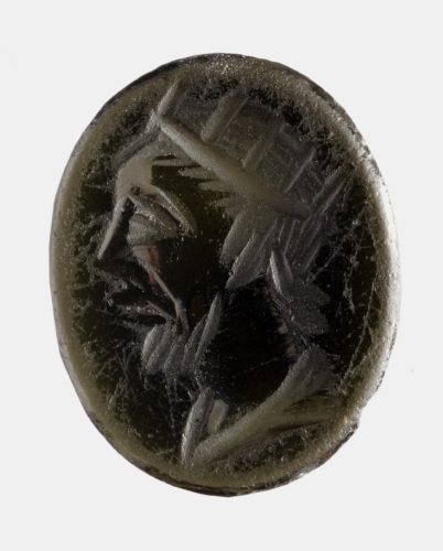 Pasta vitrea verde di forma ovale piana/piana con testa maschile barbata di profilo verso sinistra, in tunica, con corona radiata a cinque elementi. L'esecuzione risulta molto sommaria, a solchi grossi.