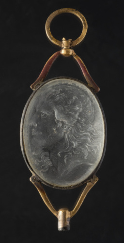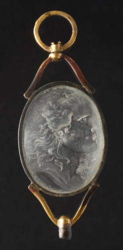 Pendaglio in cristallo di rocca inciso con profilo maschile a destra, con capelli lunghi sul collo e come agitati dal vento; rappresentato fino alla base del collo, montato a giorno. Gli occhi sono infossati, un ciuffo di capelli scende sulla guancia e un altro è inciso al di là del profilo del collo.
