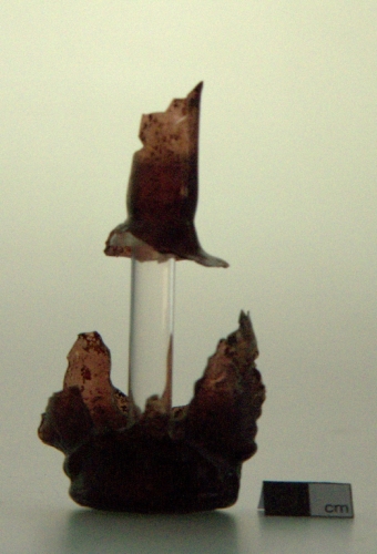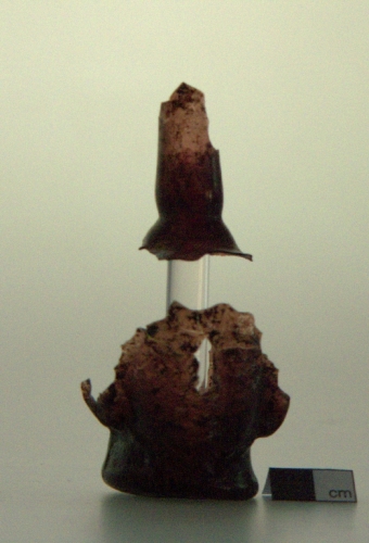 collo cilindrico, leggermente strozzato alla base; corpo configurato a doppia testa femminile (Medusa?), con volto rotondo, caratterizzato da grandi occhi a mandorla con pupille incassate, naso sottile, labbra diritte, appena socchiuse e mento arrotondato leggermente prominente; fondo piatto, caratterizzato da una decorazione in rilievo costituita da un elemento quadrangolare a lati inflessi con al centro un elemento circolare. Vetro viola, trasparente. La parte superiore è stata soffiata liberamente e solo la parte inferiore, a partire dalla capigliatura, entro uno stampo tripartito.