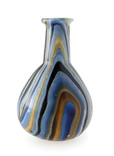 labbro esoverso ne appiattito; collo cilindrico di lunghezza inferiore a quella del corpo, leggermente strozzato alla base; ventre piriforme; fondo piatto. Canne vitree policrome opache (azzurro, bianco, blu, nero, giallo).