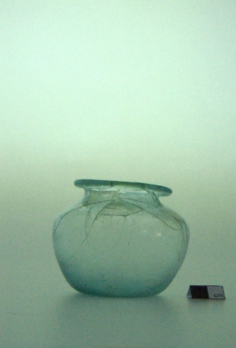 labbro estroflesso, ribattuto all'interno,spalla arrotondata, ventre globulare schiacciato e fondo leggermente convesso. Vetro azzurro trasparente.
