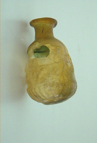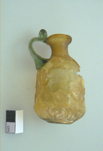 labbro estroflesso con orlo arrotondato e ripiegato all'interno; breve collo cilindrico;spalla arrotondata; corpo cilindrico con decorazione in rilievo costituita da una fascia centrale a foglie e frutti d'olivo,tra due coppie di linee anulari che la separano da due fasce decorate con costolature; fondo con piede a disco. Ansa a bastoncello, fusa a parte e applicata a caldo, impostata sulla spalla e fissata all'orlo con apofisi a bottone. Vetro giallo,trasparente. Ansa in vetro verde, trasparente.