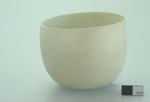 orlo tagliato a spigolo vivo, corpo emisferico, fondo piano; vetro bianco ("lattimo"), opaco