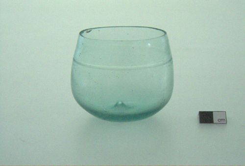 orlo tagliato e levigato, corpo "a sacco". decorato da solcature anulari, fondo appena convesso; vetro incolore, trasparente