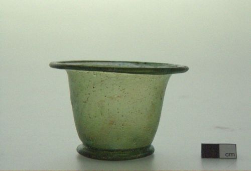 labbro estroflesso con bordo a cordoncino, corpo troncoconico, piede ad anello applicato; vetro verde, trasparente con difetti di soffiatura