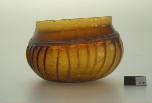 orlo tagliato e levigato, appena esoverso, breve spalla, corpo emisferico a sottili costolature decorate a spirale da filamento bianco opaco, fondo piano; vetro giallo, semitrasparente; decorazione a costolature rilevate e filamenti bianchi ottenuta a caldo