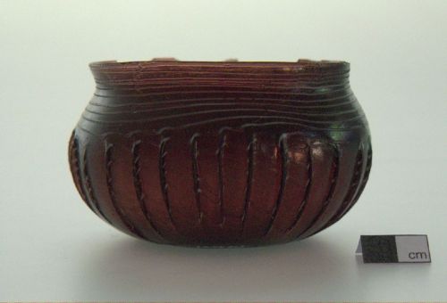 orlo diritto, tagliato e levigato, spalla decorata da filamenti disposti anularmente, corpo emisferico a sottili costolature decorate a spirale da filamento bianco opaco, fondo piano; vetro violetto, semitrasparente; decorazione a costolature rilevate e filamenti bianchi ottenuta a caldo