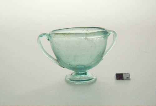 orlo ingrossato sottolineato da solcatura, sul quale sono saldate le anse a bastoncello fuse a parte, impostate poco sopra il fondo della coppa emisferica, piede a tromba fuso a parte e applicato; vetro azzurrino, trasparente