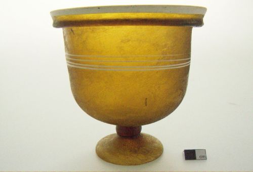 labbro a fascetta a doppia ribattitura, coppa a pareti cilindriche, decorate con filamenti bianchi anulari e fondo emisferico, stelo a nodo e piede campaniforme; fascetta in "lattimo" lungo l'orlo e filamenti bianchi opachi applicati a caldo; vetro giallo e bianco, opaco