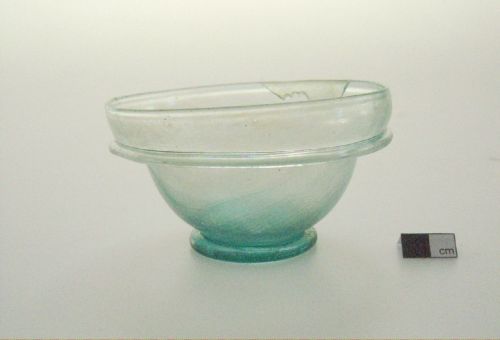 orlo diritto e arrotondato ripiegato verso il basso e poi verso l'alto, profilato in basso da un cordoncino rilevato, corpo troncoconico, piede a disco; vetro incolore, trasparente; cordonatura a rilievo ottenuta a caldo; piede applicato