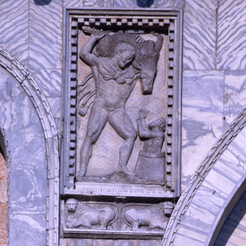 Il rilievo fu reimpiegato sulla facciata esterna della Basilica di San Marco. Il tema di Ercole ricorre più volte nella decorazione marciana.