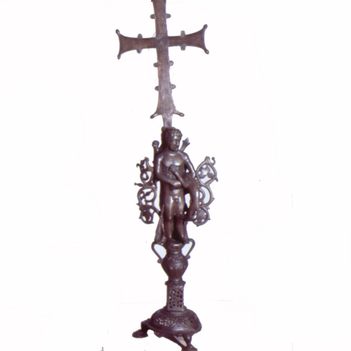 La statuetta ritrae un giovane uomo stante, che stringe tra le braccia un leone. Sul capo porta una grande croce apicata.