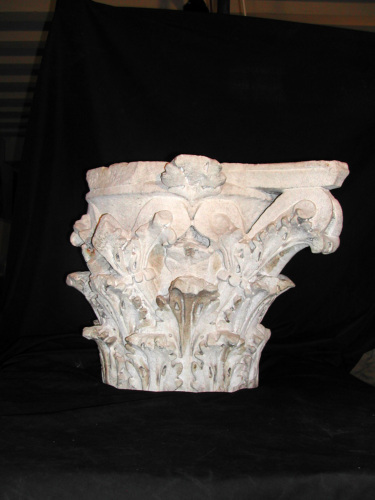 Capitello corinzio, con tre corone di otto foglie d'acanto, dalla nervatura centrale ben evidenziata.