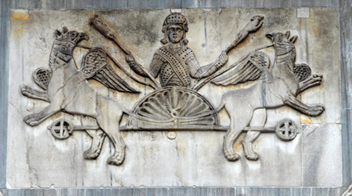 Bassorilievo con la raffigurazione di un personaggio maschile, ritratto in posizione frontale e stante sopra un carro; indossa una tunica manicata, coperta da due bande incrociate, con una mitra regale sul capo; ha le braccia aperte, simmetriche, intento a reggere due pertiche con le prede infilzate sulle punte. Al carro sono aggiogati due animali fantastici, che hanno il corpo di leone, ma la testa e ali di grifo; questi sono raffigurati di profilo, in posizione araldica con lo sguardo retrospiciente, in direzione delle prede.