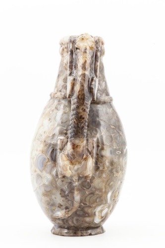 Brocca monoansata, con piatto orlo lievemente svasato, sagomato inferiormente, con cordolo rilevato alla base del collo, corpo ovoide, e piede ad anello. Sull'ansa, impostata tra l'orlo e il ventre, è scolpito un animale accucciato, probabilmente un felino, con i dettagli anatomici molto accurati, in particolar modo gli occhi e le zampe