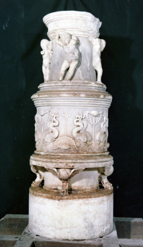 Base di acquasantiera costituita da tre cilindri, di cui quello inferiore, a tamburo liscio, doveva essere incassato nel pavimento. Gli altri due cilindri sono decorati con una sequenza di modanature aggettanti; quello mediano, sostenuto da quattro zampe leonine alate con protuberanza centrale, è decorato sul tamburo da quattro guppi di quattro delfini ciascuno, raffigurati affrontati a coppie di due, separati da un tridente che sostiene una conchiglia, mentre un gruppo è separato dall'altro da un tridente che spunta da una conchiglia. Il cilindro superiore, infine, è decorato da quattro punti, ritratti ciascuno con un atteggiamento diverso, mentre sostengono l'architrave soprastante e la vasca dell'acquasantiera.