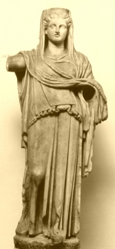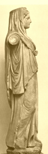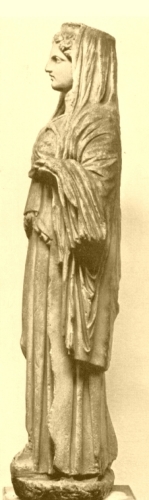 Figura femminile stante con polos e velo sul capo; indossa un peplo dorico che forma davanti un kolpos e un mantello che, gettato sulle spalle, copre la testa e quindi ricade sul braccio sinistro.