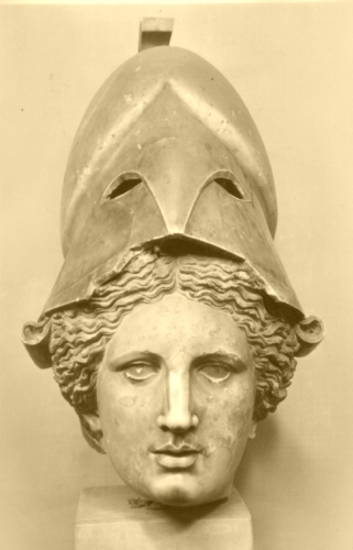 L'acconciatura è costituita da capelli divisi sulla fronte da una scriminatura centrale. Le ciocche, filiformi e mosse,dai vivavi chiaroscuri creano un netto contrasto con il volto. Sul capo la figura indossa un elmo corinzio.