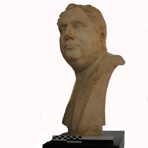 Il busto ritrae un uomo maturo, il cui volto dall'ovale pieno e paffuto, è rivolto verso sinistra. La fronte è ampia e pienamente investita dalla luce, in netto contrato con lo sguardo ombreggiato da arcate profonde e soppracciglia folte. Gli occhi sono piccoli ed in parte coperti da palpebre pesanti. Il naso tozzo e con narici espanse. La bocca è stretta e dalle labbra piegate appena verso il basso, dalla forma decisa. Il mento adiposo, le guance piene, il collo ampio sono tratti fisiognomici della persona ritratta, resi con uno schietto realismo.