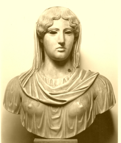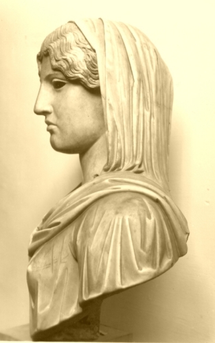 Testa femminile di Afrodite Sosandra, avvolta da un mantello disposto a collare sul petto che le copre il capo, circondando il volto luminoso entro un perfetto ovale, strutturato con armonia e inquadrato dalle plastiche chiome ondulate, ripartite simmetricamente in due bande laterali. Una sottile tunica, dalle pieghe essenziali, lascia percepire in modo delicato i tratti del seno.