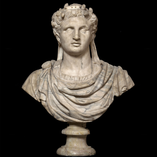L'ampia fronte è appena coperta da una corona costituita da foglie di quercia, che cingono un'acconciatura corta, costituita da boccoli arrotondati, ad uncino accanto alle orecchie. Le arcate soppracigliari sono strette e profonde e donano allo sguardo un'aspetto severo, accentuato dai grandi occhi, rivolti verso l'alto.