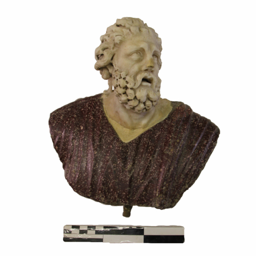 Il busto è costituito da una testa in marmo bianco, inserita in un busto in porfido rosso.