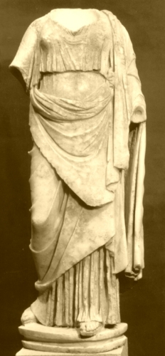 La figura femminile è stante e poggia il peso sulla gamba sinistra. Indossa un chitone che lascia trasparire le forme del corpo, il ventre e l'ombelico, ed un himation dalle pieghe rade che lasciano posto a larghi spazi piani.