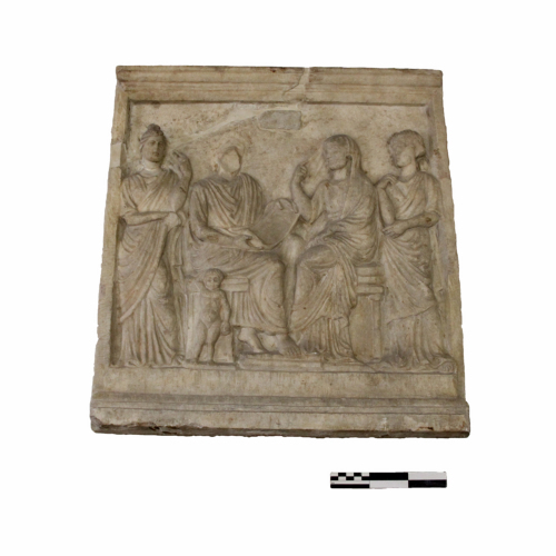 Il rilievo raffigura una scena di lettura in cui un uomo seduto, vestito di una toga dalle maniche corte, srotola un papiro davanti a se. Accanto a lui, tre donne, due in piedi e una seduta lo stanno ascoltando.