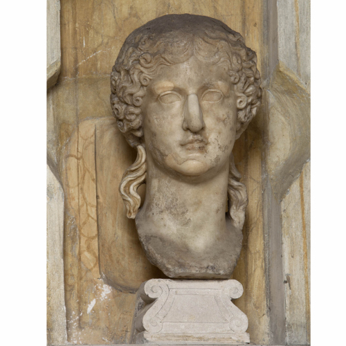 La testa è realizzata in marmo greco e possiede un viso dall'ovale pieno e dai lineamenti delicati, in cui si rileva una fronte di forma triangolare, ampie arcate sopraccogliari poco profonde in cui le soppracciglia sono rese mediante morbidi passaggi di piani, quasi fossero costituite da una linea sottile. Gli occhi sono ampi e di forma a mandorla, mentre del naso originale resta solo parte della narice destra. La piccola bocca ha labbra sottili e morbide, appena piegate in un'espressione vezzosa e intensa, di cui si coglie appena una vaga malinconia.