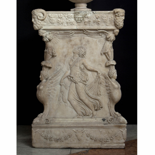 In basso è decorata da bucrani, due agli angoli e uno centrale, da cui si dipartono ghirlande di fiori e frutta. Campiscono gli spazi lasciati vuoti piccoli oggetti di carattere dioniaco. La seconda sezione, più ampia, vede un motivo d'angolo costituito da teste di ariete, su cui poggiano sfingi greche, con ali ricurve. Sul capo ogni sfinge porta un kalathos, su cui poggia le ginocchia una figura femminile panneggiata e alata. Al centro della sezione vi sono figure danzanti. L'ultima sezione è decorata sugli spigoli da teste di Giove Ammone, ritratto come divinità barbuta con le corna di ariete e all'interno invece dello spazio ornamentale, vi sono maschere dionisiache attorniate da vitigni e uva.