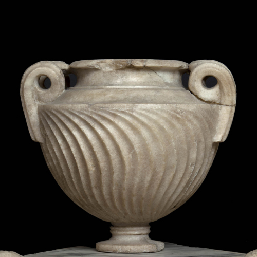 Il vaso, realizzato in marmo, presenta un piede articolato in due tondini, su cui si imposta un corpo decorato da una sinuosa strigilatura e dalla forma emisferica.