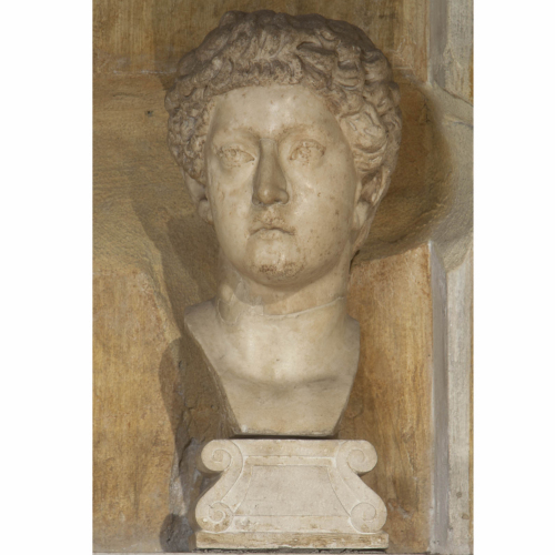 La testa ritrae una figura maschile, il cui volto dall'ovale pieno, è rivolto appena verso destra.